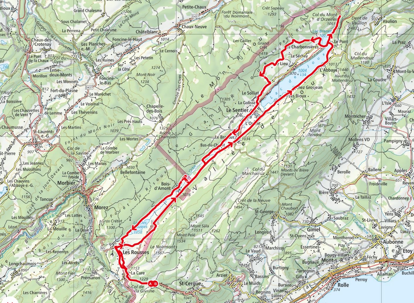 Cette sortie cyclo d’une journée propose une belle boucle d’environ 90 km au cœur du Jura vaudois et franco-suisse. Au départ du parking de La Givrine, l’itinéraire traverse notamment La Cure, Les Rousses, Bois-d’Amont, Le Brassus, Le Chenit, Les Bioux, L’Abbaye et Le Pont, avant un retour par Les Charbonnières, Le Sentier, Le Brassus, Les Rousses et La Cure.